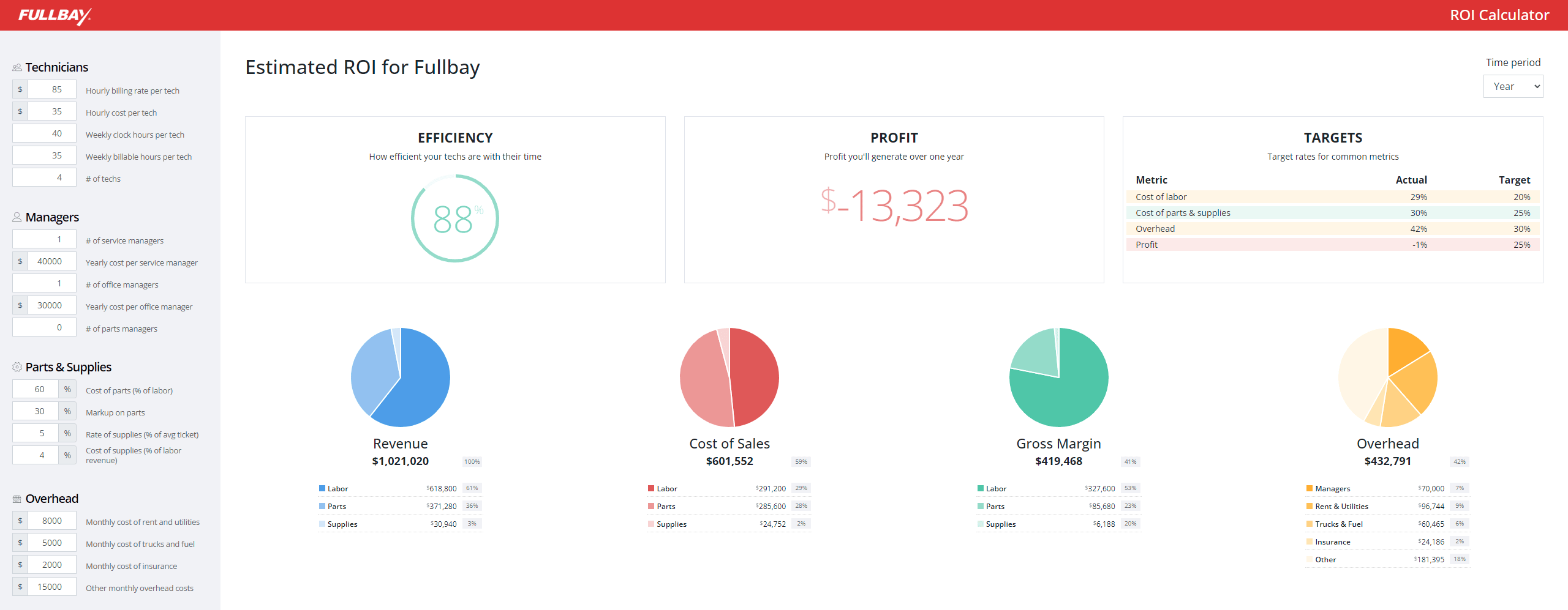 The fields on the left—Technicians, Managers, Parts & Supplies, and Overhead—are blank, waiting for you to drop in your most current numbers. When you do, they’ll generate the graphs you see on the right, indicating your shop’s efficiency, profit, and more.